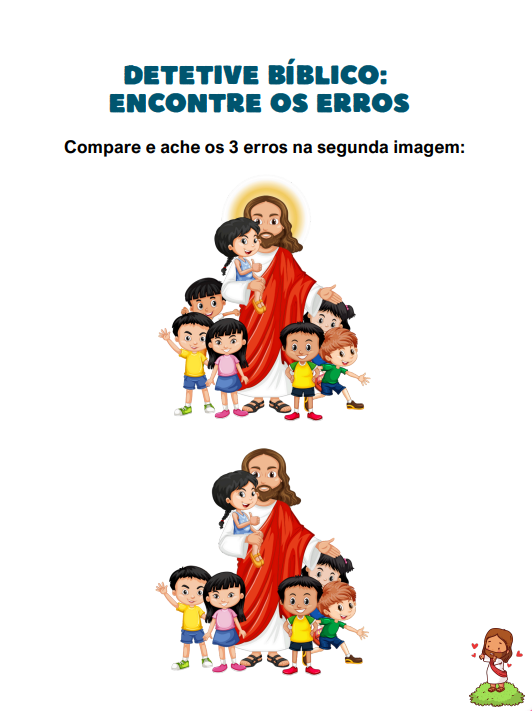 Com um olhar atento, ajude as crianças a encontrar as diferenças em cenas bíblicas. Ótimo para estimular a concentração e a atenção aos detalhes.