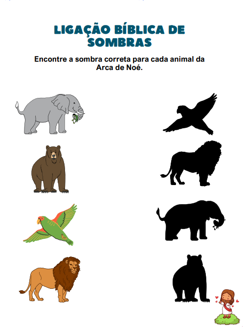 Desenvolva a percepção visual com figuras bíblicas. Uma atividade de associação de sombras que é divertida e educativa.